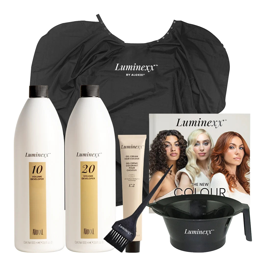 Aloxxi Luminexx™ Small Salon Opener 2023 includes color, developer, brush, cape, and chart.