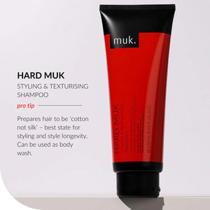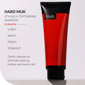 Hard muk Styling & Texturising Shampoo removes build-up, residue and excess oils that weigh hair down, enhancing volume and texture. Perfect for fine or layered hair, it’s a color-safe, non-softening formula ideal for prepping hair for styling.
