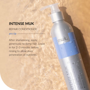 After shampooing with Intense muk Repair Shampoo, squeeze excess water from the hair and massage Intense muk Repair Conditioner from mid lengths to ends. Leave in for 1-2 minutes and rinse thoroughly.