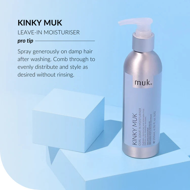 Pro Tip: Refresh second-day curls by applying to dry hair for extra moisture and bounce. For additional smoothing, Kinky muk Leave-In Moisturiser + Hot muk Serum cocktailed is great to blowave hair.