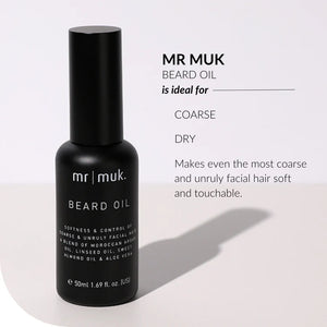 mr muk Beard Oil features Moroccan Argan Oil, Linseed Oil, Sweet Almond Oil, and Aloe Vera. This non-greasy formula effectively conditions and softens even the most coarse facial hair, ensuring a smooth, well-maintained beard. It provides deep moisturisation while being free from sulphates, parabens, and mineral oils.