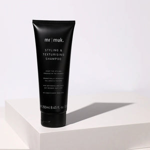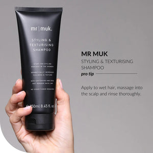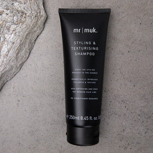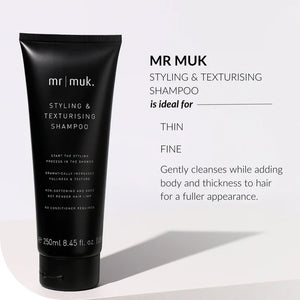 mr muk Styling & Texturising Shampoo removes build-up, residue and excess oils that weigh hair down, enhancing volume and texture. Perfect for fine or layered hair, it’s a colour-safe, non-softening formula ideal for prepping hair for styling.