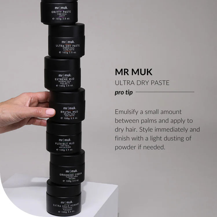 mr muk Ultra Dry Paste offers an ultra-matte finish with strong hold and added volume.