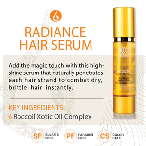 Add the magic touch with this high-shine serum that naturally penetrates each hair strand to combat dry, brittle hair instantly, while perfecting the hair surface with touchable softness and radiant shine. Infused with our Roccoil Xotic Oil Complex - Sulfate-free. Paraben-free. Color Safe. Keratin Treatment Safe.