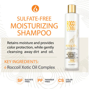 Retains moisture and provides color protection while gently cleansing away dirt and oil. The luxurious antioxidant formula hydrates and repairs dry, damaged and over-processed hair to reveal beautifully clean and radiant hair that’s ready for conditioning and styling. Infused with our Roccoil Xotic Oil Complex - Sulfate-free. Paraben-free. Color Safe. Keratin Treatment Safe.