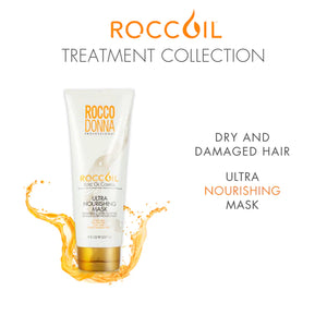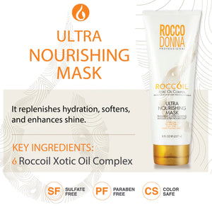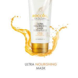 Indulge with our Ultra Luxurious Nourishing Mask. It replenishes hydration, softens, and enhances shine. This powerful formula restores body, and suppleness to weakened and damaged hair to restructure the hair fiber and renew strength. Mineral-rich oils seal and smooth the hair cuticle for smoother, stronger hair. Infused with our Roccoil Xotic Oil Complex - Sulfate- free. Paraben-free. Color Safe. Keratin Treatment Safe.