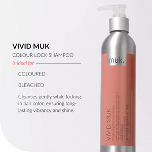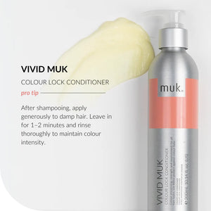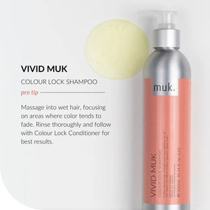 Vivid muk Colour Lock Shampoo offers fade protection and nourishment for coloured hair. It gently cleanses hair whilst protecting from premature colour fade and pigment loss. Enriched with protein, moisture and essential nutrients, increasing hair's strenght and elasticity. Vivid muk Colour Lock Conditioner smooths, detangles and replenishes the hair whilst protecting hair colour from premature fading.
